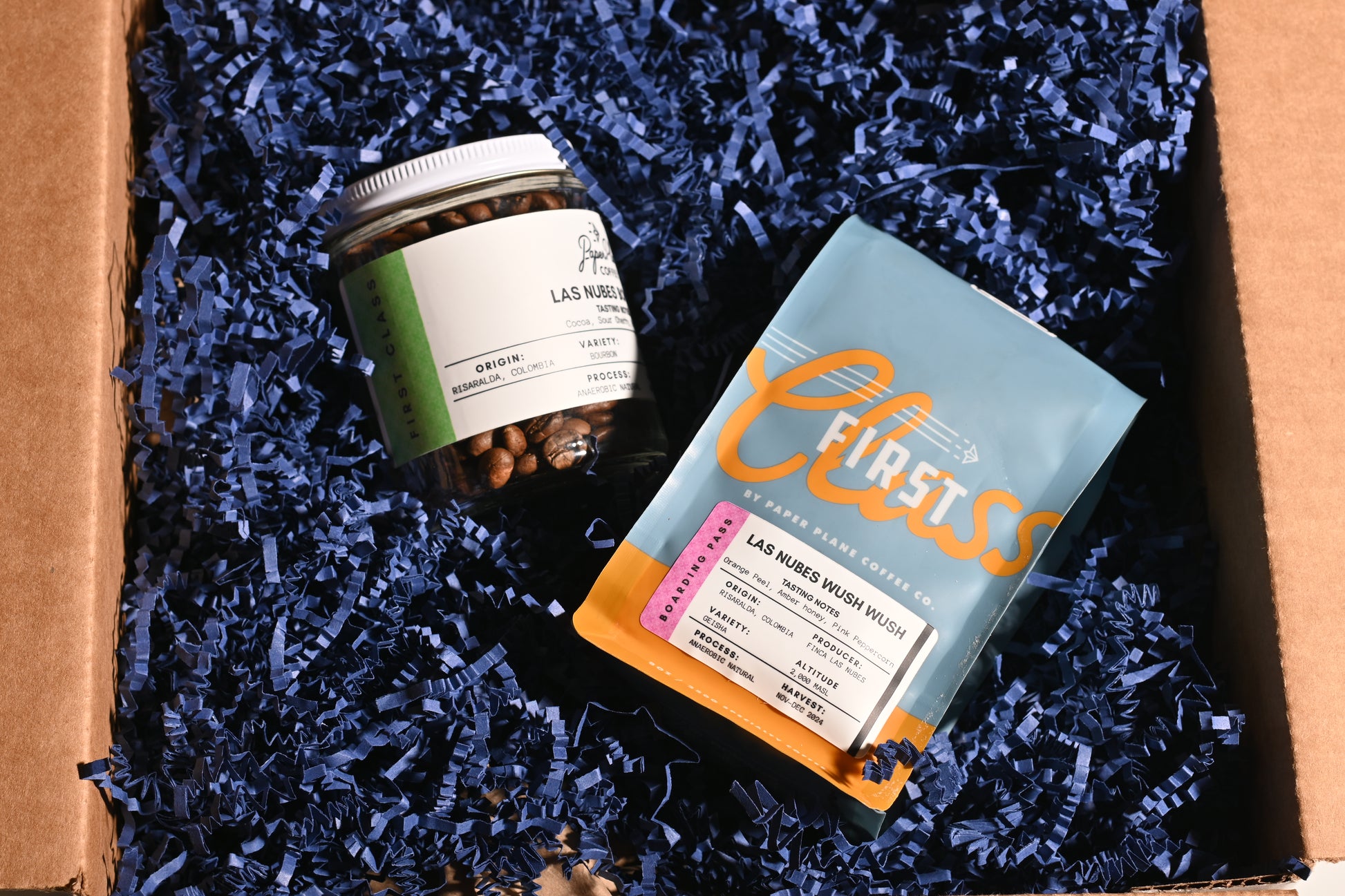 The Las Nubes Wush Wush is a rare anaerobic natural selection with layered notes of orange peel, milk chocolate, amber honey, and pink peppercorn. Presented in a glass jar, it is expressive, nuanced, and unforgettable. Paired with it is our First Class seasonal selection, highlighting another remarkable lot from the same producer. Expect deep flavors of cocoa, sour cherry, and orange peel crafted through an anaerobic natural process.